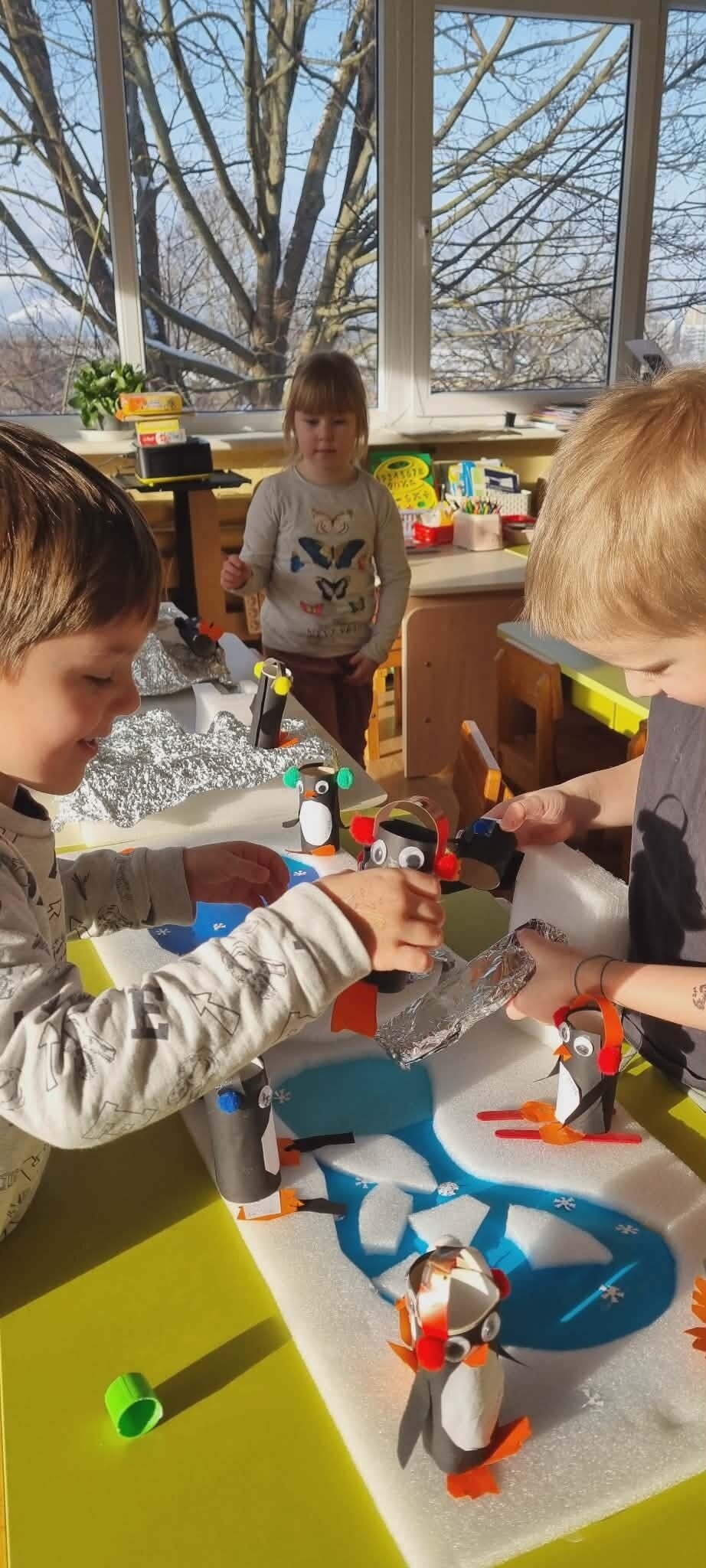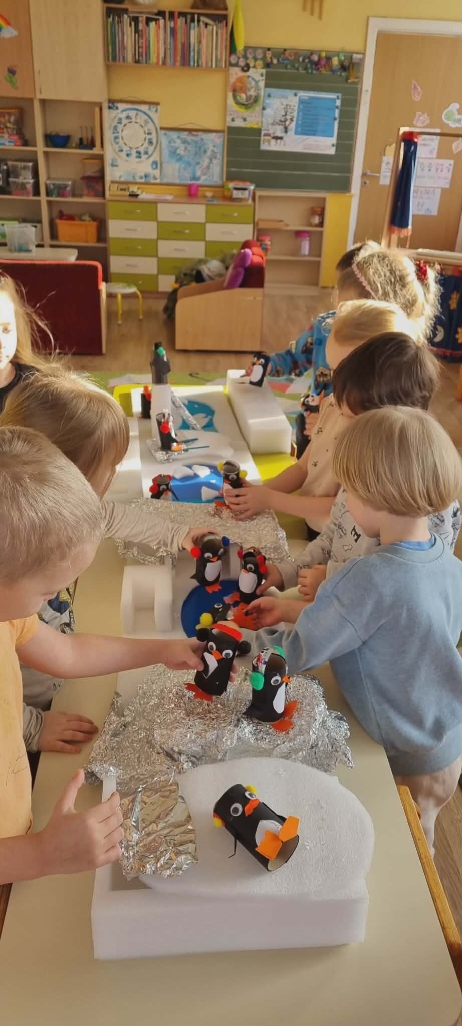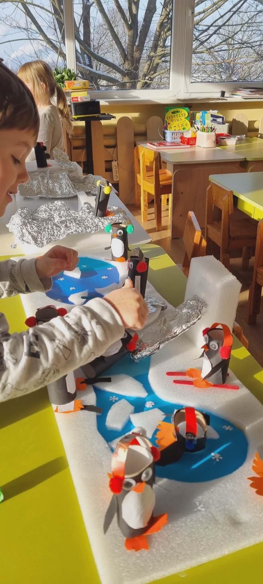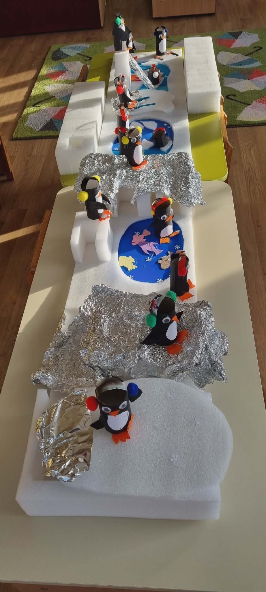 "Žiogelių" grupės vaikai ieškojo informacijos apie Antarktidos šalį. Knygose ir enciklopedijose atrado įdomių faktų apie ją, tokių kaip: baltieji lokiai turi kailį, kuris padeda jiems ištverti speiguotas arktines žiemas, o pingvinai saugodamiesi nuo plėšrūnų daugiausia laiko praleidžia plaukiodami ant ledo lyčių. Sužinojo, kad Antarktidoje nuolatinių gyventojų nėra, joje dirba tik mokslininkų ekspedicijos. Eksperimentų metu įtvirtino žinias apie ledo savybes, sužinojo, kad Antarktidos gyvūnams yra labai svarbus šaltis ir ledas, kad šiluma tirpdo ledynus, o tokios gyvenimo sąlygos kenkia šių gyvūnų populiacijai.