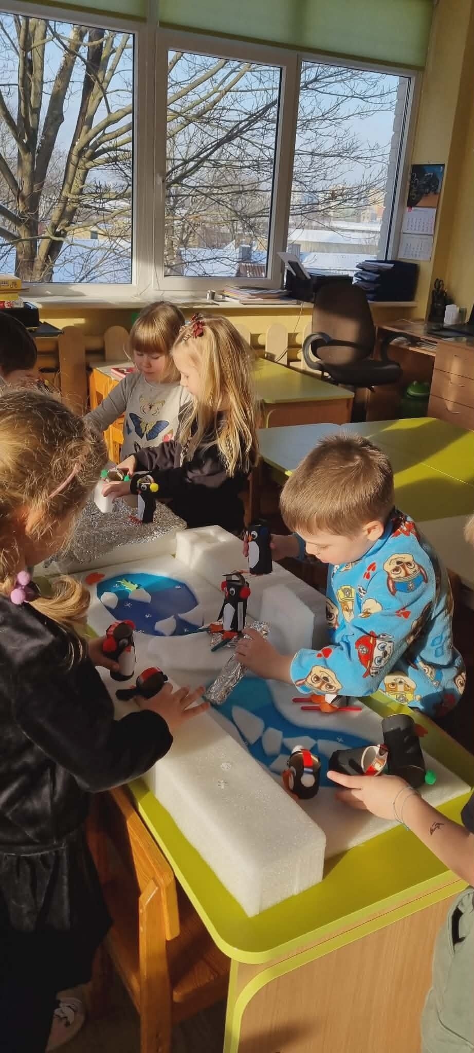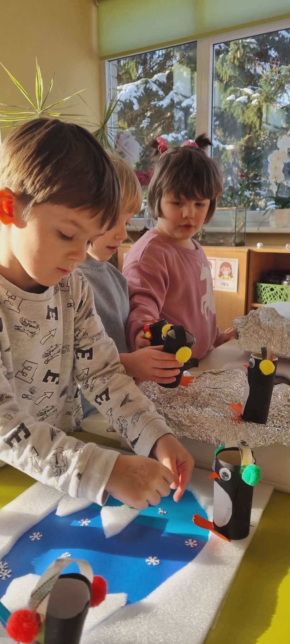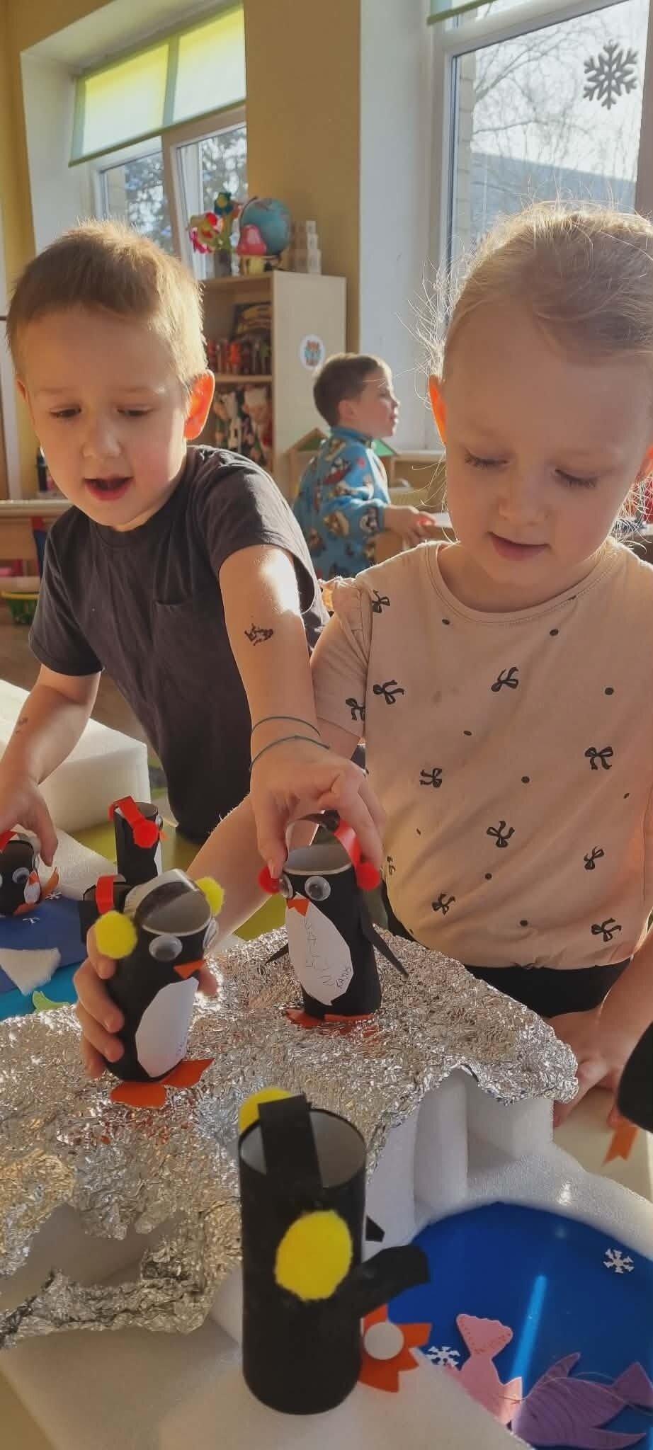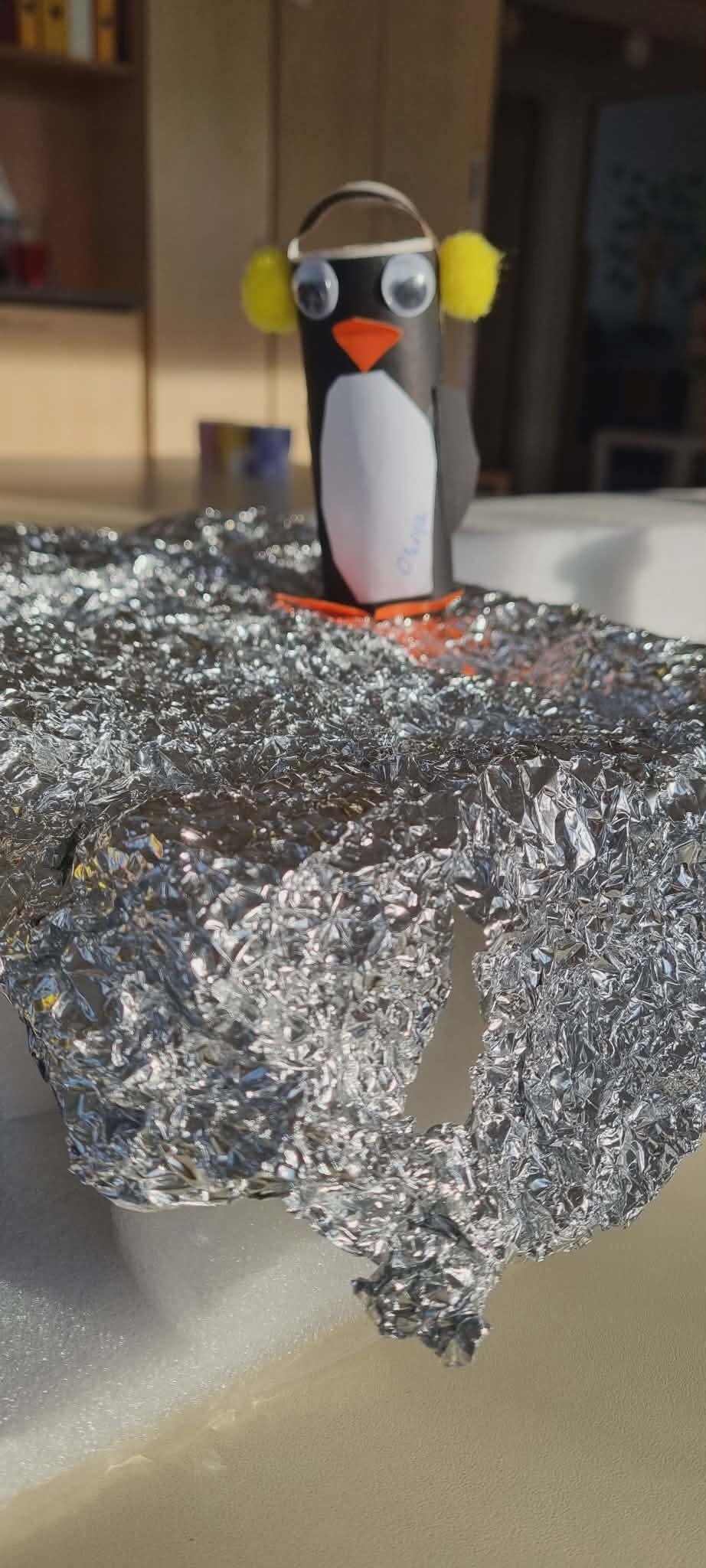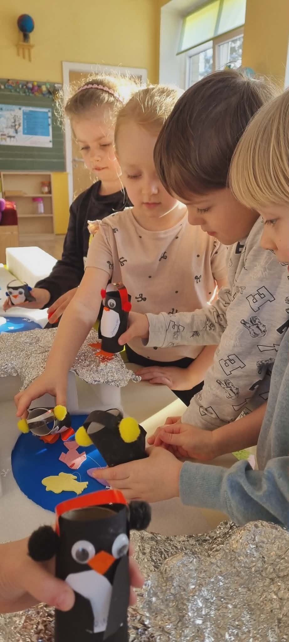 "Žiogelių" grupės vaikai ieškojo informacijos apie Antarktidos šalį. Knygose ir enciklopedijose atrado įdomių faktų apie ją, tokių kaip: baltieji lokiai turi kailį, kuris padeda jiems ištverti speiguotas arktines žiemas, o pingvinai saugodamiesi nuo plėšrūnų daugiausia laiko praleidžia plaukiodami ant ledo lyčių. Sužinojo, kad Antarktidoje nuolatinių gyventojų nėra, joje dirba tik mokslininkų ekspedicijos. Eksperimentų metu įtvirtino žinias apie ledo savybes, sužinojo, kad Antarktidos gyvūnams yra labai svarbus šaltis ir ledas, kad šiluma tirpdo ledynus, o tokios gyvenimo sąlygos kenkia šių gyvūnų populiacijai.