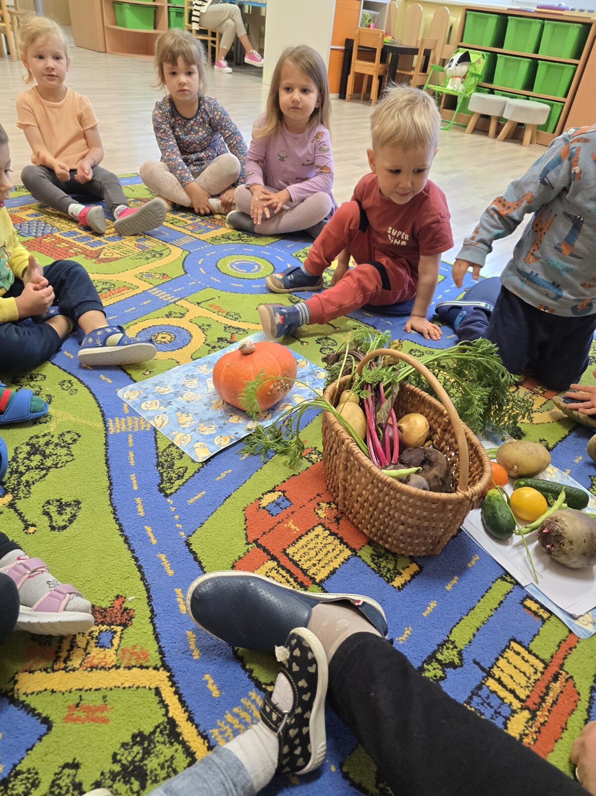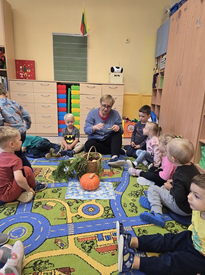 Vaikai drąsiai vardijo daržovių pavadinimus, aptarė jų spalvas, formas bei dydžius.